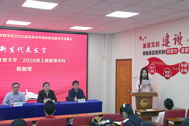 广东外语外贸大学2025级汉语言文学本科胡小雨同学作为在校生代表发言,她首先代表在校生欢迎新同学的到来,呼吁全体新生珍惜学习机会,在终身学习中不断精进,以坚定信念走好成长之路。广东外语外贸大学2026级工商管理本科韩丽莹同学作为新生代表发言,她回顾了自己从初识珠海市外经贸专修学校到最终选择珠海市外经贸专修学校作为求学之地的心路历程。她坦言,选择继续教育是为了突破职业瓶颈、补齐知识短板,将专业素养与职业发展深度融合,在未来三年的学习生涯中,将妥善平衡工学矛盾,勤学善思、深耕专业、拓宽视野,努力成长为兼具专业深度与综合广度的一精多能型人才。