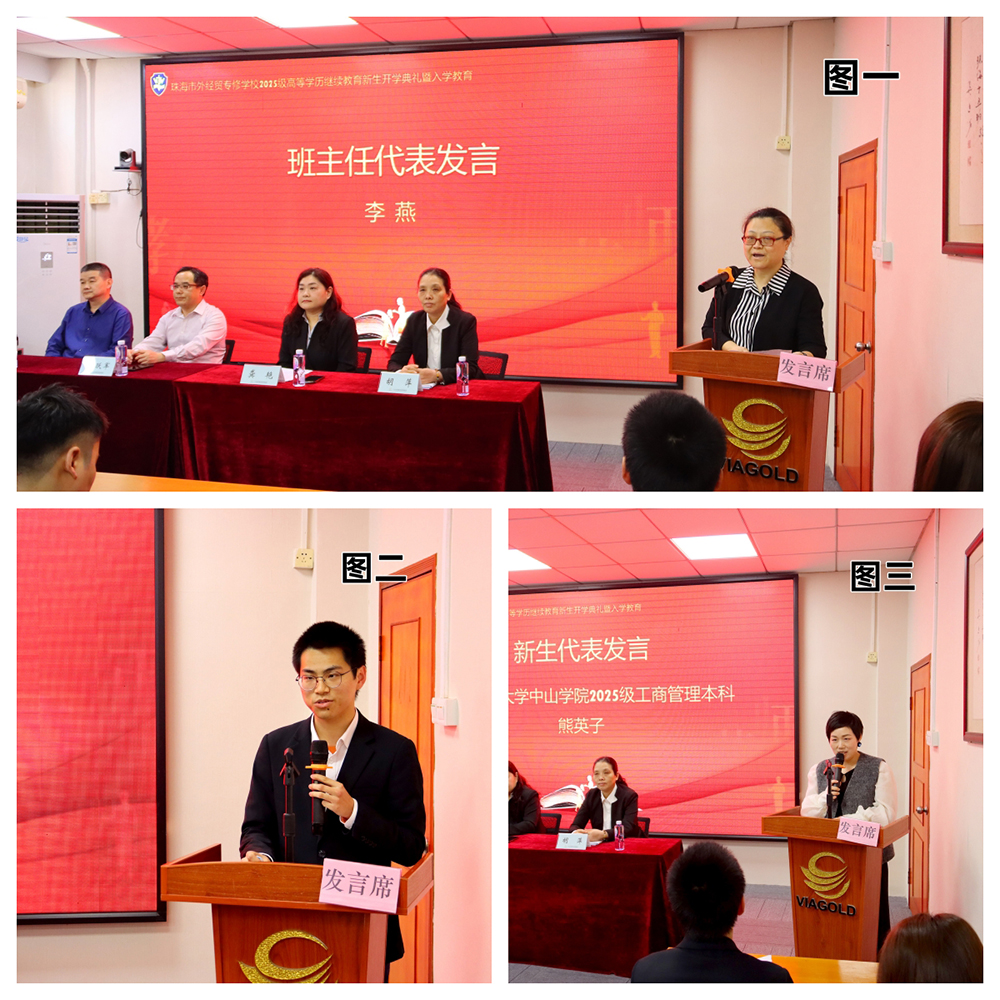 龚艳校长代表学校欢迎2025级新生加入珠海市外经贸专修学校大家庭,她指出,2024年同学们通过自身努力,克服种种困难,顺利通过成人高考进入更高一层的学习阶段,是对自我成长的郑重承诺,也是对“终身学习” 理念的积极践行。龚艳校长向全体新生提出三点希望。一要以学促行,知行合一,将课堂知识与实际工作结合,用学习成果推动职业发展;二要保持热爱,坚守初心,面对困难时不放弃,用信念和行动证明 “学习永远不晚”;三要携手同行,共同成长,在班级中相互支持、相互激励,营造良好的学习氛围。